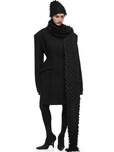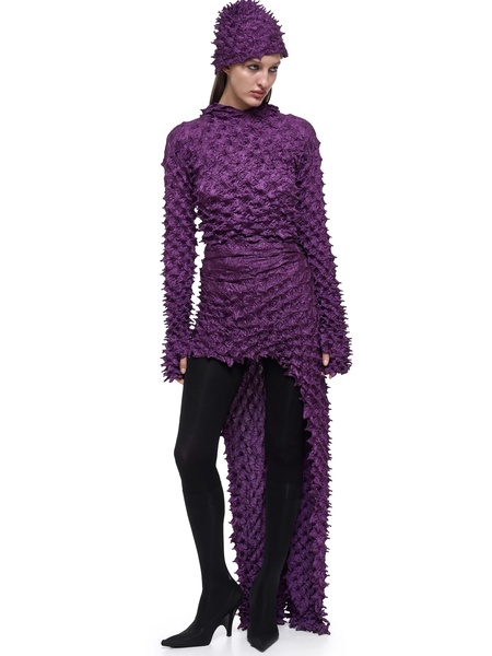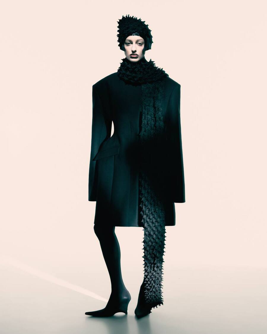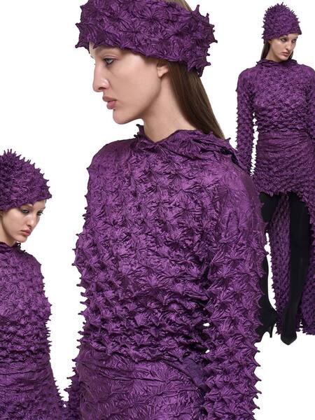 Талия в ряде моделей нарочито узкая, но силуэт перерастает в масштабный объем за счет плечевых линий, драпировок и выразительных форм. Плиссировка в виде колючек добавляет графичность и текстуру, которая „уколет“ взгляд».