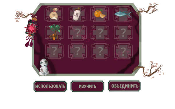 The inventory is Sanbo’s table. In Japan, this table is used to store things and domestic gifts to the Cami gods. Functions: — Use — Study — Unite