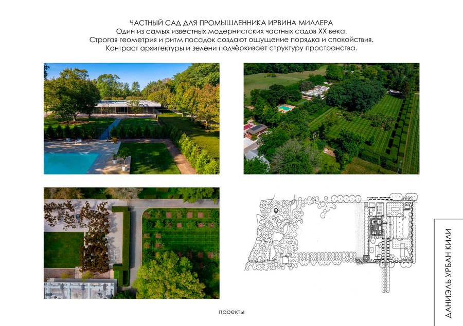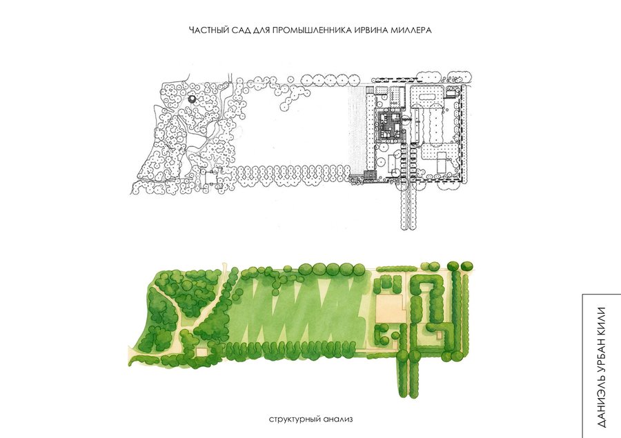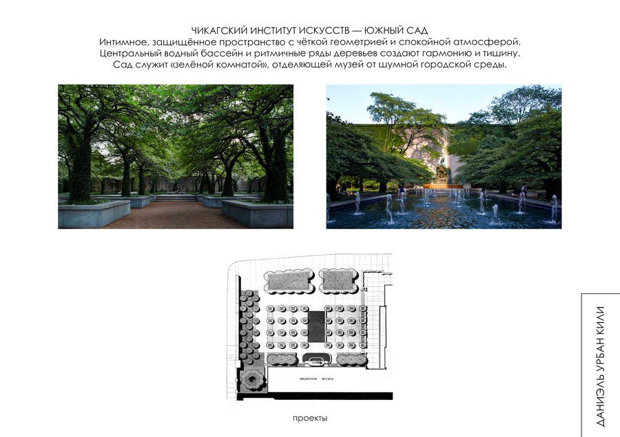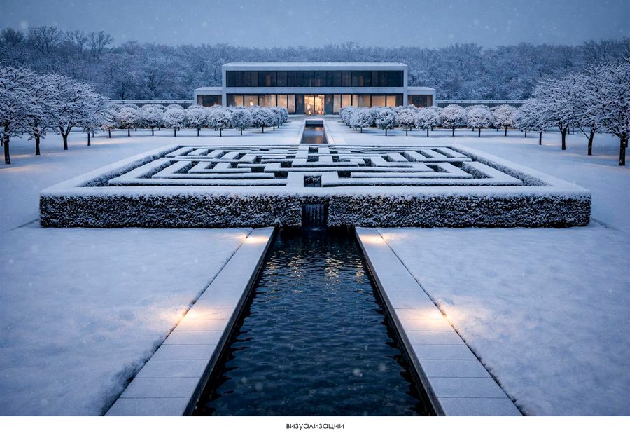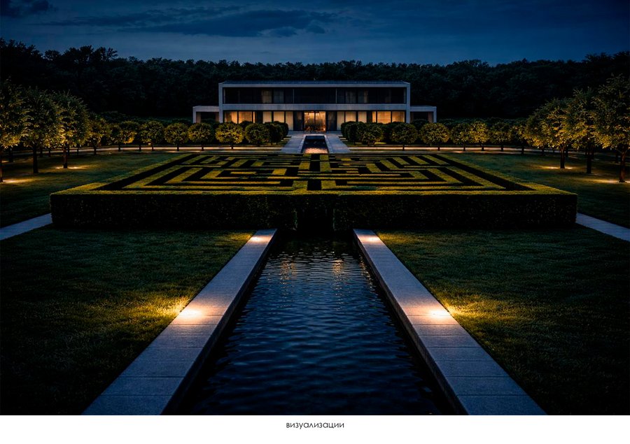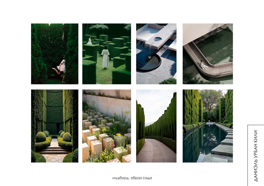 Данный сад вдохновлён принципами ландшафтного архитектора Даниэля Урбана Кили: строгая геометрия, ясная структура и ритм пространства формируют спокойное, созерцательное место. Лабиринт, водная ось и регулярные ряды деревьев переосмыслены в моём собственном проекте, создавая современный сад-переживание, основанный на идеях порядка, тишины и внутреннего пути.