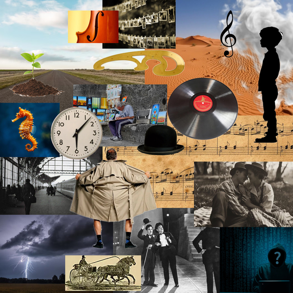 2. На второй картине Магритта главный герой — чёрный силуэт мужчины в пальто и котелке, рядом маленькая карточка с повозкой и извивающаяся фигура из нот. Многие увидели тему дороги и времени: росток на пустом шоссе как начало новой жизни, вокзал и часы, будто время застыло в момент выбора; гроза и дымка — как знак, что «что-то случилось». Другие считывают слой музыки и памяти: вырез на скрипке и скрипичный ключ, виниловая пластинка, морской конёк, похожий на тот самый нотный завиток; фотографии и немое кино, как ожившие воспоминания. Есть версия про мальчика в пустыне, который ещё не нашёл свой путь, и «городского сумасшедшего» в плаще, и историю любви: пара на фото как возможная супруга, которую герой приходит навещать. При этом часть зрителей пишет про анонимность и «человека-тень», у которого непонятно ни лицо, ни роль.