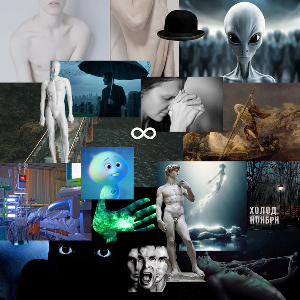 3. Здесь снова тот самый мужчина в пальто и котелке, но со спины, а за ним в воздухе «плывёт» бледное обнажённое тело на фоне реки и моста. Респонденты почти сразу уходят в темы смерти и границы между мирами: миф про реку Стикс, выход души из тела, похороны, труп, холод, ноябрь, что-то завершённое. Кому-то это напоминает сонный паралич или депрессию, когда ты смотришь на себя со стороны и не можешь пошевелиться. На мудборде поэтому появляются реанимация, отделение души, скорбящие, античная статуя и манекен — тело как неживой объект, у которого даже сложно понять, мужчина это или женщина.