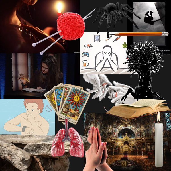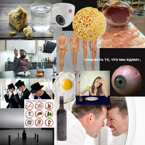 19. На картине как будто одно тело сразу и женщины, и мужчины: голая тяжёлая фигура и пиджак, который её сжимает. Зрители видят в этом толстую женщину, которая себя не любит, и мужской силуэт, который давит и осуждает. Появляются темы феминизма и ненависти к своему телу: общество постоянно сравнивает, ты «не такая» и «не влезай в нормы». Параллельно идёт линия про маньяка и преследование: сталкеринг, мужчина, который не даёт ей покоя, цепляется, контролирует, как будто прилип. Поэтому в мудборде — страх, темнота, мужчина за спиной, закрытый рот, крики и паника. Есть и сексуальный слой: они как одно целое, у них есть связь через секс, но эта связь токсичная — много агрессии, боли и стыда. Нитки и линии читаются как зависимость, когда двоих стягивает вместе, хотя им плохо.