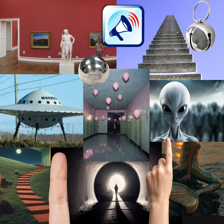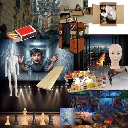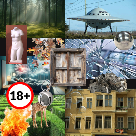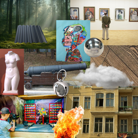 20. На этой картине снова та же «комната-коллаж», как в «Шести элементах»: стены собраны из фрагментов дерева, металлических «столбиков», пламени, леса, неба с облаками и фасада дома, а на полу стоит чёрная пушка, торчащая из этого странного интерьера. Респонденты говорили, что пространство похоже то ли на выставочный зал, то ли на тир: вроде бы галерея с разными «картинками-окнами», но внутри стоит настоящая пушка, как аттракцион. Поэтому на мудборде появляются лесная поляна с металлическим навесом, классическое пушечное ядро-шар, детский тир с яркими мишенями, огонь, фасад обычного дома и снова гипсовый торс — то же самое тело, которое уже мелькало в других работах. Пушка считывается как что-то опасное и детское одновременно: воображаемый выстрел по стене с окнами, по дому, по небу с облаками. Повторяющиеся элементы вроде торса, металлического шара и фасада дома связывают эту картину с предыдущими: как будто зрителя запускают в ту же самую «комнату сознания», только теперь к спокойным панелям добавили оружие и тему игры в войну.