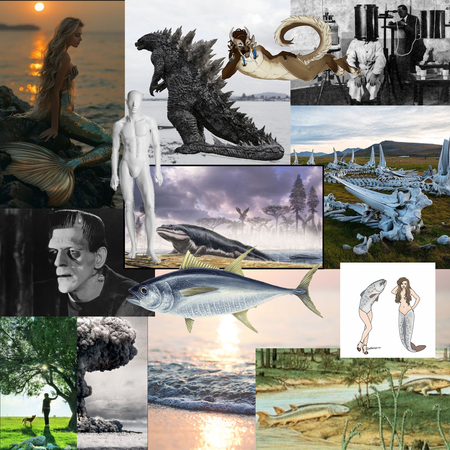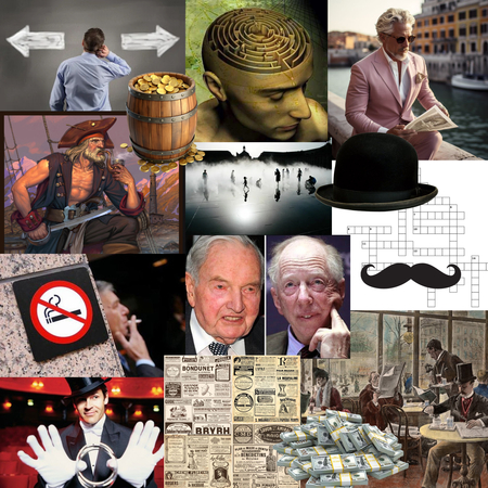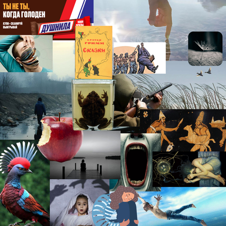 8. На картине двое мужчин в пальто и котелках стоят на странном ночном берегу, среди белых «облаков» на песке и серого моря, рядом — клубок меха/волос с торчащей рукой. На мудборде сразу видна тема двойников: пара одинаковых мужчин, манекен, фигуры, стоящие спиной-к-спине. Кажется, что это один и тот же человек, который разделился на две версии себя — та, что смотрит на зрителя с закрытыми глазами, и та, что отвернулась к морю. Отсюда чтение про внутренний спор, про «я» дневное и ночное, рациональное и скрытое. Вторая линия — женский образ, который вообще почти не видно на самой картине. Клубок меха начинает читаться как волосы русалки или ведьмы, как чья-то шевелюра, сбившаяся в ком. На мудборде появляются русалочка под водой, девушка с длинными чёрными волосами, кружево, белое платье, перчатки. Это уводит в сторону скрытой женственности, желания, которое либо пугает, либо прячут под пальто и котелками. Третья линия — природа и тревога за неё. Пакеты и белая ткань напоминают не только волосы, но и мусор в море. Собачья шерсть рифмуется с меховым клубком, граница между животным, человеком и пейзажем размывается.