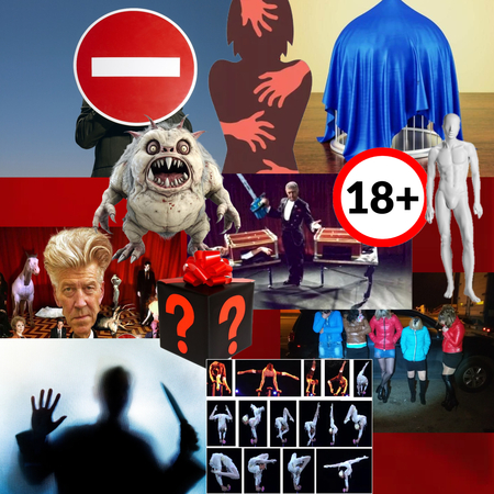 9. На этой картине видно обнажённое тело сбоку с накинутой простынёй: как будто есть только голова и ноги, а середина исчезла. По бокам стоят ещё две похожие «кучи ткани» в красной комнате. Респонденты почти сразу считывают тему запрета и «18+»: красный знак «въезд запрещён», плашка 18+, манекен без лица — всё это про тело, к которому вроде бы тянет, но «нельзя». Монстр на мудборде читается так, будто женщина под простынёй сама превращается в чудовище, когда её тело делают объектом. Подарок-коробка с вопросительным знаком и кадры из тревожного фильма усиливают ощущение неизвестности: непонятно, что именно скрыто под тканью и чем всё закончится. Параллельно появляется линия цирка и трюков: иллюзионист с распиленной девушкой, акробаты в перевёрнутых позах — тело как номер, как аттракцион. Девушки у машины считываются как проститутки и добавляют прямой сексуальный подтекст и ощущение риска, возможного насилия.