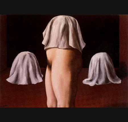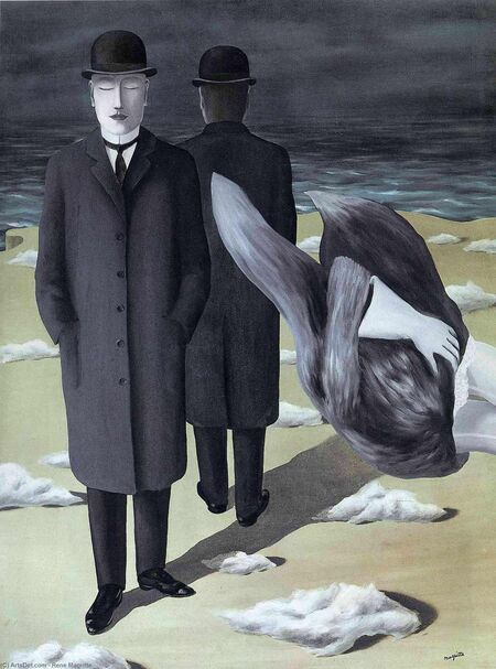 У Магритта часто появляются фигуры, у которых закрыто лицо. Тело и одежда хорошо читаются, по позе и силуэту мы понимаем, кто перед нами — мужчина, женщина, пара. Но самое главное место для «узнавания» человека — лицо — художник специально прячет. Из-за этого зритель не может до конца понять эмоции и характер героя, не может «считать» его как привычный портрет. Такой приём создаёт дистанцию и ощущение недосказанности: вроде всё видно, но главное остаётся закрытым.