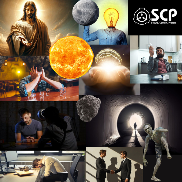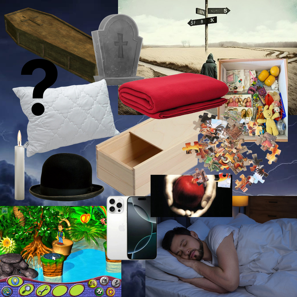 11. На картине человек лежит в узком деревянном ящике: одни респонденты называют это кроватью, другие — гробом или просто коробкой. Он укрыт красным пледом, голова на подушке; под ним висит странная «плита» на фоне тёмного неба. Большинство решили, что это могильная плита, но часть так и оставила её «непонятной формой». На этой форме вырезаны силуэты предметов: свечи, шляпы, яблока/плода, птицы, банта — кто-то видит в них пазл или детскую игру, отдельные фрагменты жизни. Отсюда на мудборде появляется коробка воспоминаний с фотографиями, билетами и игрушками, разлетевшиеся пазлы, яблоко в руках, знак вопроса, развилка дорог, телефон как ещё одна «ниточка» связи с миром. Некоторые считают, что это просто набор воспоминаний спящего: странный сон, где перемешались прошлое, страхи и любимые мелочи. Другие же размышляют на тему того, чем может закончиться его жизнь и какой путь он в итоге «соберёт» из этих деталей.