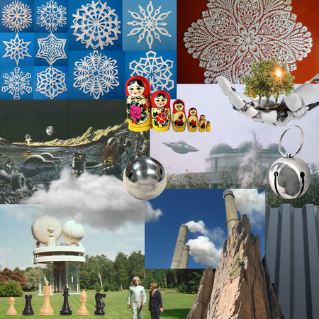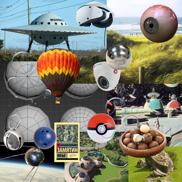 10. На картине три гладких металлических шара с тёмной полосой посередине висят в чистом голубом небе над зелёным полем. Мнения респондентов сильно разрознились, они называли эти шары: спутниками, НЛО, деталями шлема виртуальной реальности, мыльными пузырями, шарами для боулинга, покеболами, орехами макадамия, бубенцами. Появляются символы камеры наблюдения, огромного глаз — тема наблюдения «сверху». Рядом — 3D-объекты и сетки, воздушный шар, футуристическая «деревня будущего» из круглых домов, космические станции, камни и роман Замятина «Мы». Для части зрителей это фантастика и игра: шарики, как элементы виртуального мира или аттракциона. В других ответах эти же формы уже читаются как приборы слежки, которые висят над обычным ландшафтом и незаметно управляют пространством.