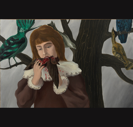 6. На этой картине девочка в старинном платье стоит у дерева и ест мёртвую птицу, а вокруг на ветках сидят другие яркие птицы и просто смотрят. Почти все сначала цепляются за шок: «бедная птица», «что за тиранша», «фу, как неприятно», многим просто жалко животных. Потом у всех начинают расползаться свои сюжеты. У кого-то в голове всплывает реклама Snickers — «ты не ты, когда голоден»: ради голода человек готов выйти за рамки норм. Кто-то сразу думает про власть и охоту: девочка как хищник, который чувствует себя сильнее и держит в руках жертву, почти как на жертвоприношении. Были ассоциации со сказками Братьев Гримм, с мотивом запретного плода и Евой, с потерей невинности. Для других эта картина про экологические проблемы и насилие над природой: человек срывает с дерева «живой плод» и ломает хрупкость мира вокруг.