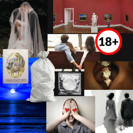13. На этой картине мужчина в костюме и женщина в красном платье целуются, но у обоих на голове белая ткань. Она похожа и на фату, и на мешок, и просто на кусок ткани. Фон похож на угол комнаты в галерее и одновременно на тёмное небо. Респонденты сразу разошлись на несколько линий. Первая — романтическая. Ткань воспринимается как фата, вспоминаются свадьба, море ночью, фраза «любовь сильнее смерти». Для этих людей это история про пару, которая остаётся вместе даже после смерти: тела и лица уже не важны, важна только связь, которая как будто вышла на другой уровень. Вторая линия — про закрытую или выгоревшую любовь. Здесь ткань уже как мешок, который душит и закрывает обзор. Люди физически рядом, но не видят друг друга. На мудборде появляются пары, сидящие спиной, люди, уходящие в тумане, девушка с сердечками вместо глаз — слепая влюблённость, привычка. Чувства как будто по инерции есть, а настоящей близости уже нет: каждый живёт в своём мире под своей тканью. Есть и более жёсткое чтение, связанное с сексом и безопасностью: знак 18+, презерватив, белый мешок. Тогда сцена выглядит как отношения, где главное — физический контакт и защита, а не доверие. Всё завёрнуто и закрыто, партнёры боятся показать настоящее «я» и постоянно прячутся друг от друга.