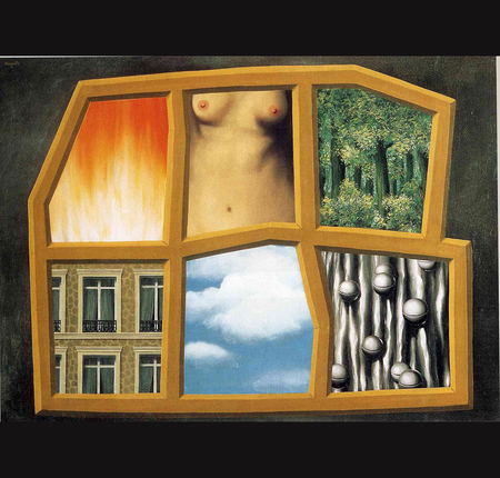 У Магритта очень часто есть занавесы, кулисы, окна и рамы. С их помощью он как будто напоминает зрителю: перед нами не «настоящий» мир, а картинка или сцена. Когда внутри одной картины появляется ещё одна рама или занавес, создаётся эффект второй картинки внутри первой. Пространство начинает выглядеть как выставка или театр. Так Магритт показывает, что любой вид можно оформить как экспозицию, а граница между реальностью и изображением всегда условная.
