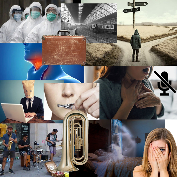 15. На этой картине девушка в бордовой кофте стоит рядом с тубой и коричневым чемоданом. Лицо полностью закрыто белой тканью, рука лежит на горле — зрители сразу цепляются именно за этот жест. Первая линия — медицинская. Для части респондентов чемодан выглядит как врачебный, на мудборде появляются врачи в защитных костюмах, красное горло, кашель, панические атаки. Это читается как история про тело и болезнь: страх удушья, ковида, смерти. Здесь либо сама девушка — врач, либо она уже пациентка. Вторая линия — про голос и цензуру. Рука на шее и образ «выключенного микрофона» превращают её в человека, которому нельзя или страшно говорить. Ткань на лице становится знаком запрета и маской, под которой приходится жить и молчать. Есть и более мягкое чтение — про музыку и сцену. Туба и уличные музыканты на мудборде напоминают, что это может быть история про артистку, которой ужасно страшно выходить к публике: она боится взглядов и оценок, но всё равно тащит инструмент к людям. Отдельно считывается тема дороги: вокзал, развилка, чемодан. Это добавляет ощущение неопределённости, будто она уже собрала вещи, но не понимает, в какую сторону двигаться. Поэтому для кого-то эта картина — про страх задохнуться и умереть, для кого-то — про запрет на высказывание, а для кого-то — про человека, который боится выйти наружу и ещё не нашёл свой путь.
