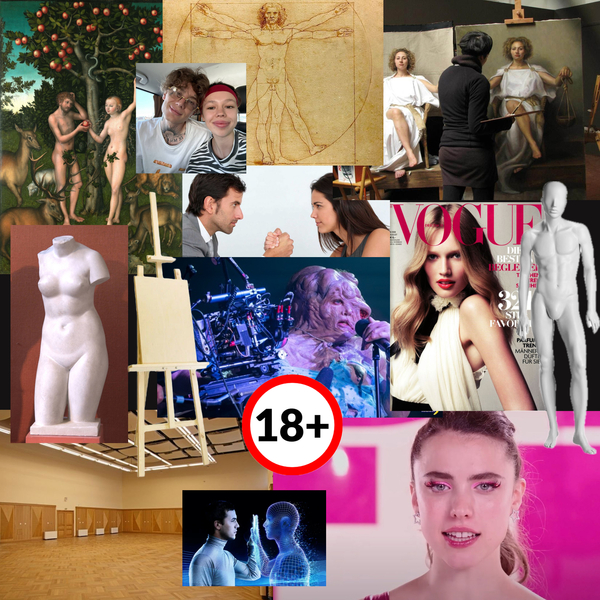 16. На этой картине мужчина-художник стоит с палитрой и кистью перед обнажённой женщиной: вместо холста — её тело, он прямо по нему рисует. Большинство сразу замечают, что модель здесь как объект. Отсюда линия «художник и натурщица»: на мудборде появляются гипсовый торс, мольберт, пустой зал галереи. Женщина будто превращена в учебный манекен, на котором отрабатывают навыки, а не в живого человека. Вторая линия — про идеальную картинку и медиа. Обложка Vogue, манекен, сцена, свет, кадры из фильма «Субстанция». Девушка на картине тогда становится «инстасамкой» своего времени: снаружи — идеальный образ, внутри — тишина, пустота, робот, который должен соответствовать чужим ожиданиям. Есть и прочтение через отношения мужчины и женщины. Эдемский сад, парные кадры, знак 18+ — это уже история про власть и контроль. Мужчина как будто «создаёт» женщину под себя, дорисовывает нужные черты, а она стоит неподвижно и не может этому сопротивляться.