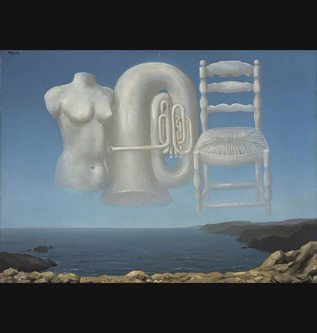 17. На этой картине над морем в воздухе висят три предмета: обрубленный женский торс без головы и рук и ног, белая туба и простой стул. Зрители почти сразу видят в этом странный набор, как натюрморт, выдернутый из комнаты и подвешенный над пейзажем. Дальше версии расходятся. Для одних это намёк на жертвоприношение и обряд: торс как статуя или жертва на алтаре, море и камни — как место ритуала у воды, а стул — пустое место, где раньше кто-то сидел. Другие видят тему разорванного тела и идентичности: человек как конструктор, разобранный на части — тело, голос (туба) и место для зрителя или слушателя. Есть чтение про объективацию: женский торс, инструмент и мебель становятся одинаковыми «вещами» одного цвета и масштаба, и непонятно, что в этой тройке важнее.