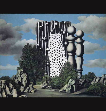 21. На этой картине Магритта посреди скал и кустов стоит странная вертикальная конструкция: чёрные блестящие столбики, между ними белый паттерн, а рядом две светлые фигуры, похожие на большие пешки или матрёшек. Респонденты отмечали, что белая вставка похожа на бумажную снежинку или кружевную салфетку. Фигуры сбоку считываются как шахматные фигуры или набор матрёшек, которые выстроились у какого-то портала. Ещё у многих включается линия про старые фантастические истории: вспоминаются фильмы («Гостья из будущего») и книжки про космос, странные куполообразные станции, трубы заводов с дымом. Зрители отдельно отмечают, что тут снова появляются знакомые по другим картинам символы: металлические шарики и бубенцы, столбики-шахматы, одиночное облако. Из-за этого кажется, что мы находимся в одном мире.