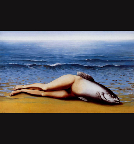 23. На этой картине Магритта на песке у моря лежит странное существо: рыба с человеческими бёдрами и ногами, как будто русалку перевернули наоборот. Зрители почти сразу начинают думать про монстров и эксперименты: вспоминают Франкенштейна, лаборатории, где собирают гибридов из разных тел, манекенов без лица, мутантов вроде Годзиллы. Параллельно всплывает тема эволюции и экологии: картинки из учебников про выход первых существ из воды на сушу, современные рыбы, фотографии кладбища китов на Чукотке. Кто-то видит здесь намёк на последствия ядерных испытаний и взрывов бомб, после которых с живыми организмами могло произойти всё что угодно. В какой-то момент становится непонятно, где заканчивается миф и научная фантастика и где уже начинается реальная экологическая катастрофа: мир на картине выглядит так, будто границы стерлись, и мы не до конца понимаем, кто здесь «нормальное» живое существо, а кто — продукт чужого эксперимента.
