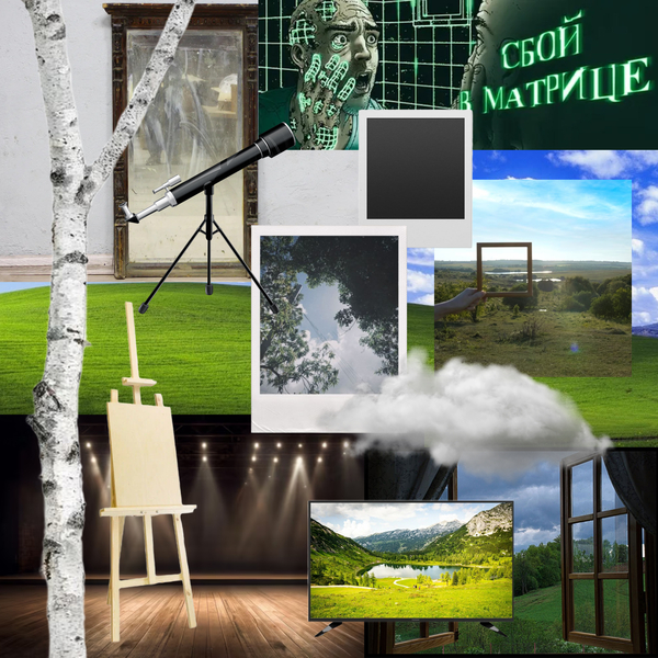 22. На этой картине Магритта мы снова внутри комнаты: перед нами большое окно с коричневыми шторами и вид на поле, дерево и облака, а у подоконника стоят три ножки мольберта — но холста нет, пейзаж как будто уже «написан» прямо в окне. Зрители сразу цепляются за эту странность, говорят про «сбой в матрице» и момент, когда непонятно, где заканчивается реальный мир и начинается картинка. Поэтому на мудборде есть такие симаволы: окно читается как экран, который транслирует природу, как заставка на обоях Windows или фон на стене деревенского домика. Мольберт превращается то в телескоп, через который мы разглядываем реальность, то в фотоаппарат: отсюда фотокарточки с кусочками неба и веток, идея отпечатка — один и тот же пейзаж существует и за окном, и на фотографии, и на экране.