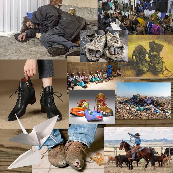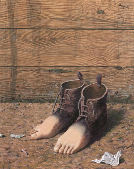 25. На этой картине Магритта у деревянной стены стоят коричневые ботинки, у которых вместо подошвы — голые человеческие ступни. Как будто ноги вросли прямо в обувь и стали одним целым. Зрители сразу выходят на тему бедности и выживания: вспоминают бездомных, детей, которые ходят босиком, старые стоптанные ботинки и кроссовки «до дыр», ботинки из картин Ван Гога, тяжёлый ручной труд. Бумажный кораблик рядом многие воспринимают как мусор: обрывок бумаги, случайную детскую поделку, которая лежит у ног и усиливает ощущение грязи и неблагополучия. На мудборде появляются свалки, старые вещи, тема плохой экологии. Улыбающиеся «живые» ботинки считываются как попытка сделать эту тему декоративной и безопасной, почти игрушечной, хотя за ней стоит очень жёсткая реальность. Образ ковбоя на лошади имеет абсолютно противоположное значение — свобода движения и выбора своего пути.