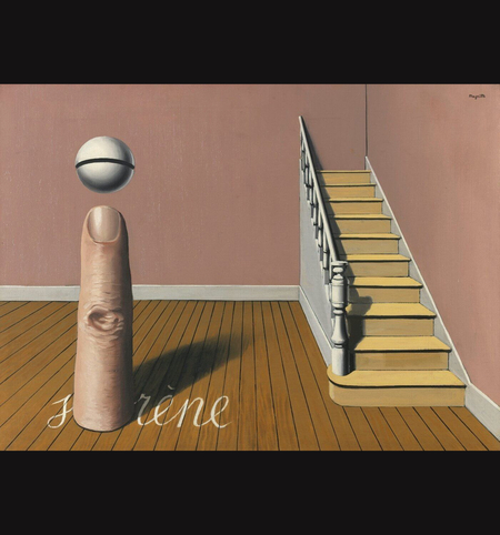 26. На этой картине у Магритта почти ничего нет: розовая пустая комната, деревянный пол, справа тянется вверх лестница, которая обрывается где-то за краем кадра. Посередине стоит огромный палец, как отдельный столб, а над ним висит гладкий металлический шар с тёмной полосой. Внизу написано слово Sirène — кто-то читает его как «русалка», кто-то как «сирена» и сразу вспоминает и мифических существ, и тревожный звук. Зрители говорят, что вся сцена похожа на кусок странного сна или коридор в музее, где лестница ведёт то ли к свету в конце тоннеля, то ли просто в пустоту. Палец воспринимают как указатель или немой микрофон: он уже поднят, как будто вот-вот что-то включит или на что-то нажмёт, но тишина. Шар уже знакомый элемент, который разбирался выше — отсюда ассоциации с пришельцами, сигналами, эхом в пустом помещении, металлическими шариками.