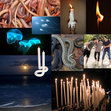 27. На этой картине изображен тёмный пляж и три свечи, которые будто расплавились и ожили: у них длинные вытянутые «хвосты»-основания, ползущие по песку. Респонденты в интервью говорили, что эти формы напоминают дождевых червей, змей, медуз, глистов и даже сперматозоиды — те же белые тела с маленькими светящимися «головами». Огонь сразу добавляет ритуальный подтекст: вспоминаются церковные свечи, длинные ряды огоньков в храмах, когда люди молча стоят и о чём-то думают. У многих всплывала ассоциация с тремя друзьями, которые идут по берегу и о чём-то спорят. Вся картина про странное соседство жизни и опасности: огонь горит рядом с морем.