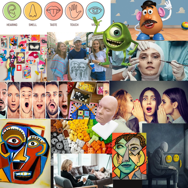 28. На этой картине Магритта как будто собрано лицо без лица: один глаз висит отдельно, под ним ухо на месте носа, ниже — губы, а вся конструкция стоит на двух носах, как на ножках. Зрителям это сразу напоминает персонажей вроде Майка Вазовски и мистера Картофельной головы из мультфильмов, где глаза, рот, уши можно переставлять местами. На мудборде из-за этого появляются иконки пяти чувств, наборы эмоций на лицах, шаржи и карикатуры, кубистские портреты с разложенными по плоскости частями лица. Дальше часть респондентов уже говорит про «создание человека»: картинка напоминает пластического хирурга или сборку лица по деталям. Отсюда лего, мозаика и коллажи — человека как будто собирают так же, как конструктор. Другая группа зрителей вспоминает терапию и разговоры с психологом: когда своё «я» раскладываешь по полочкам, смотришь, что ты на самом деле видишь, слышишь и говоришь, и пытаешься вытащить из всей этой мешанины какого-то настоящего себя.