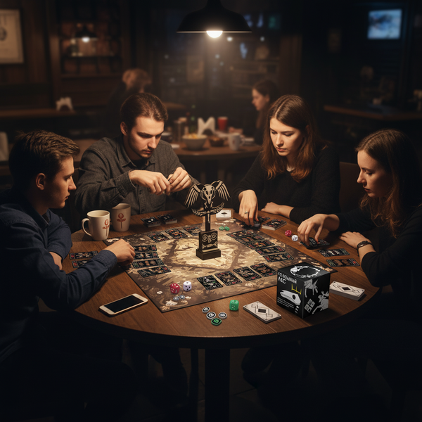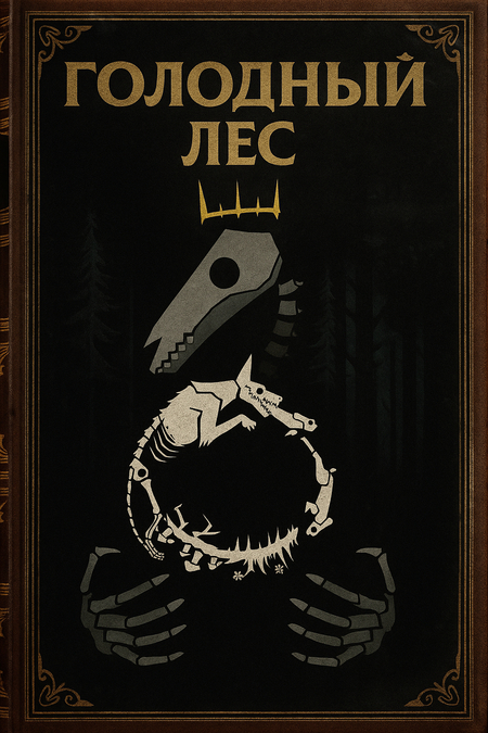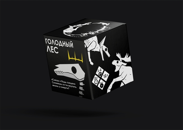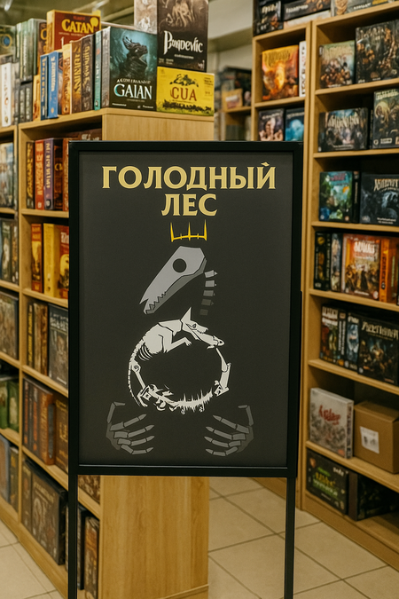 Промт игроков на столе для Nano Banana: «A dimly lit wooden table in a cozy board game cafe. Several players (mixed genders, 20s–30s) sit around the table, deeply focused on playing a dark fantasy tabletop game called „Голодный лес“ (Hungry Forest). On the table are illustrated cards with animals, skull tokens, and circular food tokens labeled „трава, ” „плоть, ” and „гниль.“ The game board features dark forest imagery and a central totem with a skeletal bird motif similar to the reference art. The players’ faces are illuminated by warm, soft light; the atmosphere is tense yet immersive. Include the game box with the „Голодный лес“ poster art visible. Realistic lighting, cinematic depth of field, detailed textures, 4K.» - Отправлен референс коробки, карт, элементов игры, пример людей за настольной игрой. https://nanobanana.ai/