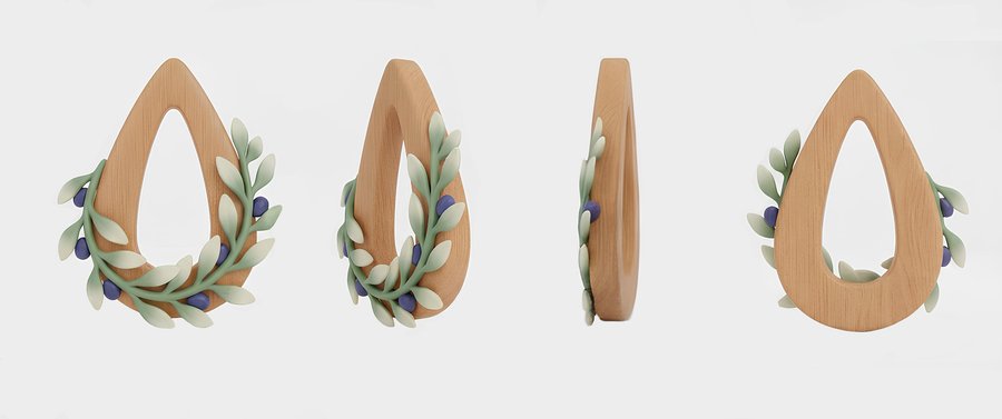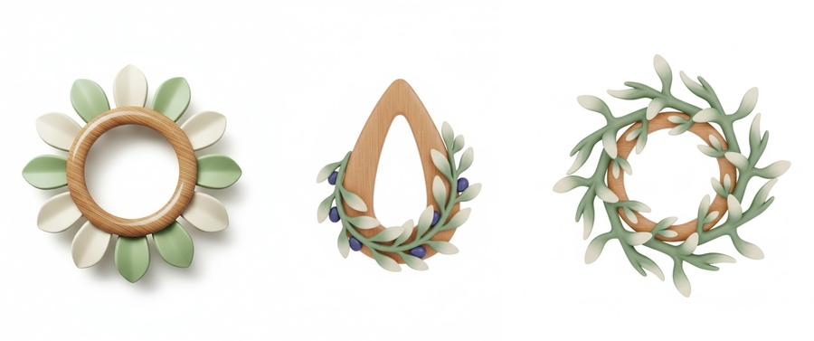 Промпт: A full collection of hair accessories inspired by nature, including round hair clips with leaves, flower-shaped clips, teardrop-shaped vine clip, and decorative hair sticks with buds and small branches, arranged elegantly on a surface, smooth organic curves, natural wood and resin textures, matte or lightly glossy finish, soft and harmonious colors, styled for product photography, warm and soft lighting, shallow depth of field, realistic studio shot, on a subtle natural background (like soft beige, linen, or light wood), high-quality 3D render, minimalist and natural aesthetic, highlighting textures and shapes