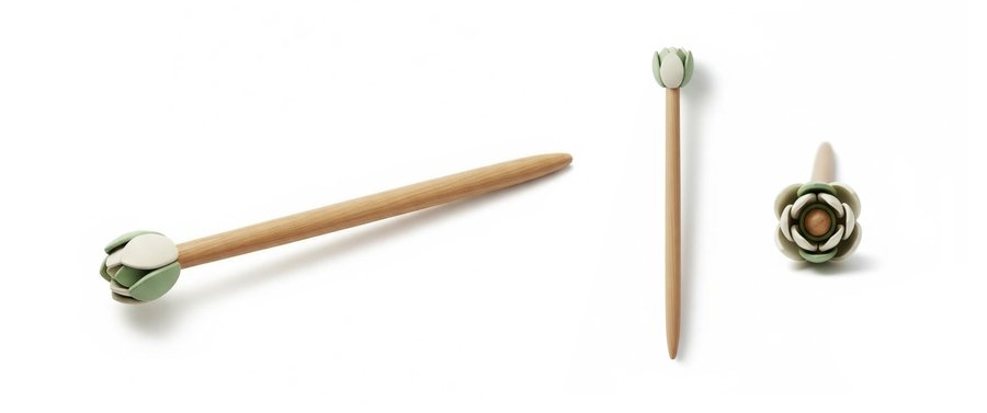 IV. A hair stick with a small decorative flower bud on the end, smooth cylindrical shape, natural wood or resin material, matte or lightly glossy finish, ergonomic and elegant, minimalist and organic design, product photography style, isolated on a pure white background, high-quality 3D render