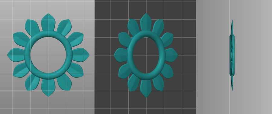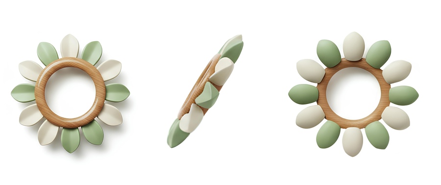 I. A round hair clip inspired by a flower, circular base with evenly spaced petals extending outward, smooth and flowing organic shapes, natural wood, resin, or ceramic look, matte or soft glossy surface, ergonomic and elegant, product photography style, isolated on a pure white background, high-quality 3D render, natural and minimalist design