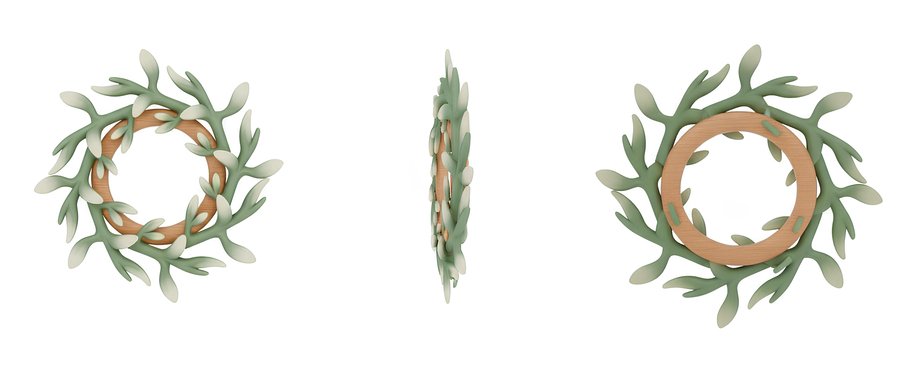 III. A round hair clip inspired by nature, circular frame wrapped with thin branches and delicate leaves, smooth and organic curves, natural wood or polished resin look, matte or soft slightly reflective surface, ergonomic and elegant, product photography style, centered on a pure white background, high-quality 3D render, minimalist and natural design