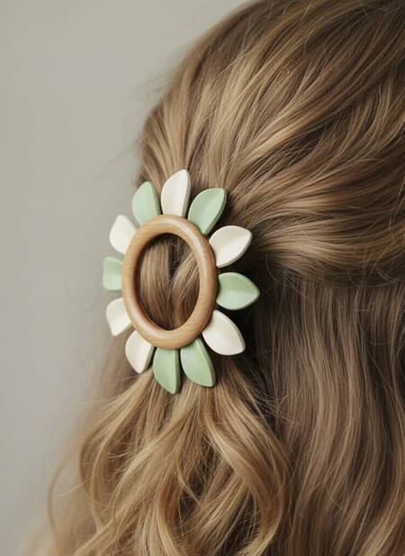 Промпт: Lifestyle photo of a woman wearing a nature-inspired hair accessory, natural hairstyle, relaxed and calm expression, soft daylight, organic and minimal aesthetic, neutral background, editorial fashion photography, slow-living mood