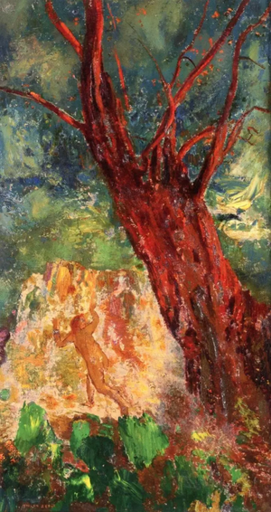 О. Редон, «Красное дерево, убегающая фигура» (1900)/М. Врубель, «К ночи» (1900)