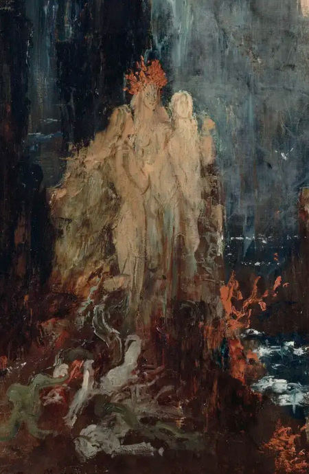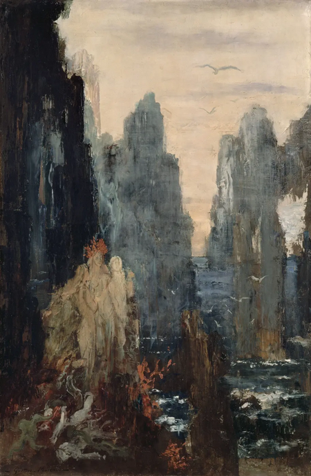 Г. Моро, «Сирены» (1876): лишь по атрибутам в лице окружающих персонажей моря и скал распознаются древнегреческие сирены.
