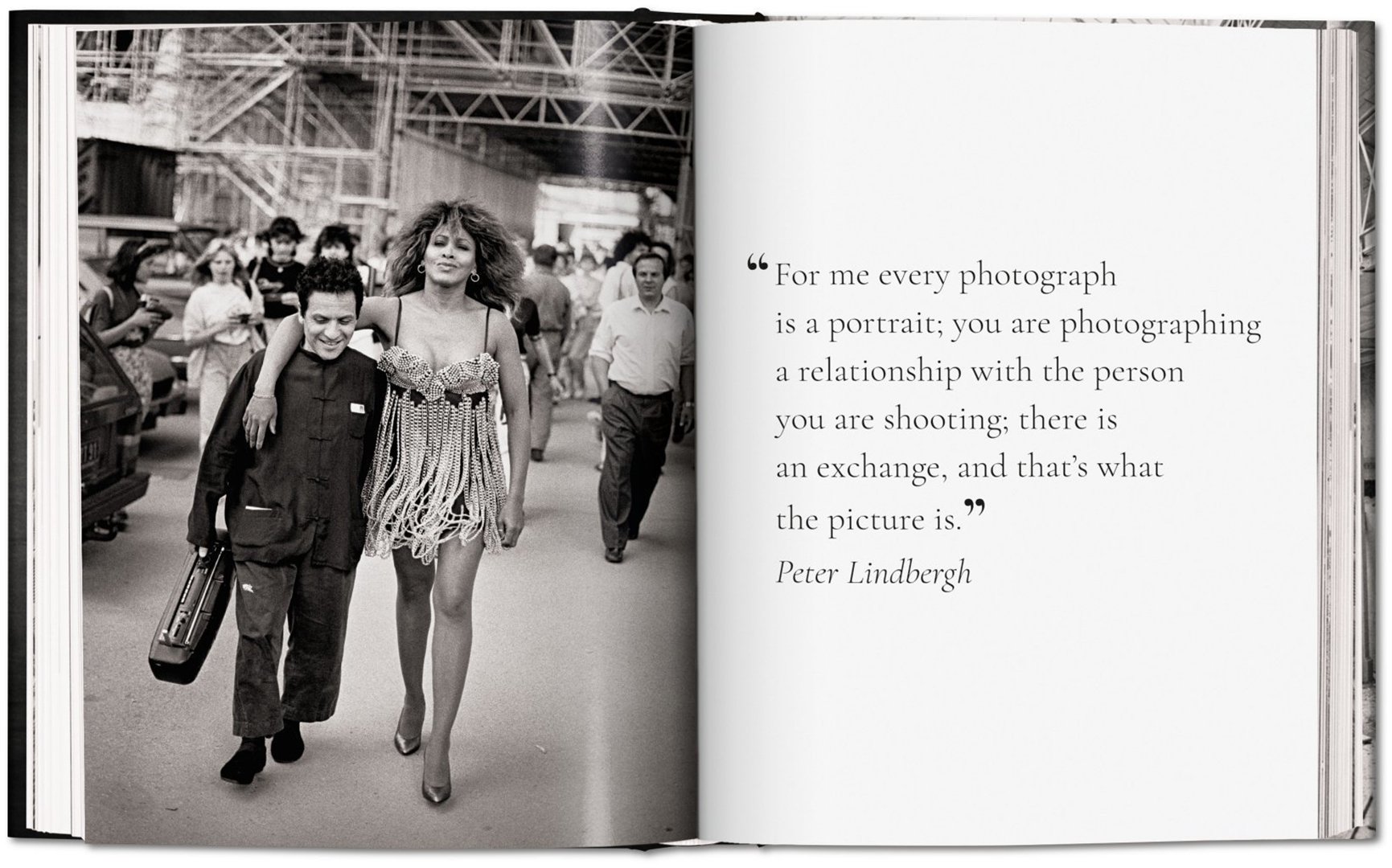 «У Питера Линдберга и Аззедина Алайи много общего: они оба любили черный цвет, предпочитали простоту форм и были большими ценителями красоты. „Кажется, мы познакомились в 1979 году. С тех самых пор стали неразлучны“, — сказал как-то Линдберг. Алайя отзывался об их дружбе и совместной работе с тем же чувством уважения: „Нам даже не нужны слова — все происходит само собой“.»