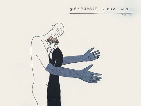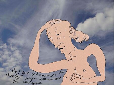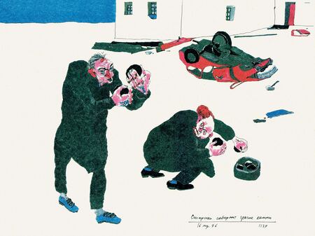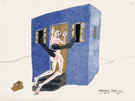 М: Вы уже упомянули микенские вазы. Вы погружались в эту историю. Никогда не возникало желания оживить этот мир? Театр позволяет это создать. А: Театр — это рассказ, рассказ — это развитие, это история. Во время развития сюжета происходят метаморфозы с действующими персонажами. Они приходят к катарсису, все умирают, исполняют последнюю арию. Мне же всегда хватало статичных изображений. Причем в них может быть изображено движение, но это движение не предполагает дальнейшего развития. Такой у меня статичный способ восприятия действительности. Есть слова и линии, которые нельзя повторить. Существуют разные способы рисования — кто-то может 20 лет писать одну картину. У меня не хватает на это терпения. Я одну линию провел — и всё. Во второй раз не получится провести такую же линию. Я ее ценю за то, что она провелась, потому что очень часто она проводится независимо от моей воли. Быстрый рисунок делается сразу, как пишется стихотворение. Если ты не успел записать несколько слов, вставших в ряд, ты можешь их никогда потом не вспомнить. Может быть, именно поэтому многие поэты ставят дату написания стихотворений — в другое время оно не могло быть написано. Я тоже всегда ставлю даты на свои картинки. М: Вас ведет случайность, и в театр она вас не привела… А: Может быть, если бы я попал не в 11 группу МАрхИ, а в другую, я оказался бы в театре, как Сергей Бархин, создавший свои гениальные театральные декорации, в которых даже и играть нет смысла — ими всё сказано. Может быть, я бы занимался театром в другие времена. М: Например, во времена Хармса? Собственно, Хармс, которого вы припомнили, пошел в театр — и получилась замечательная пьеса «Елизавета Бам». Не было желания двинуться в театр абсурда? А: Не получилось, были другие дела. Наши возможности в этой жизни ограничены — на всё времени не хватает. И, как назло, спектакли, которые я иногда смотрел, мне не нравились. Последний — по роману Пелевина «Айфак 10». От романа ничего не осталось, и опять все кричали. Я вообще не понимаю, зачем надо экранизировать литературные произведения.