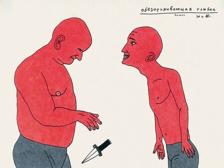 М: Вы же в собственном творчестве не ограничиваетесь только рисунком, вы добавляете слово. Получается, что вам чего-то в рисовании как таковом недостаточно? Неужели не возникало потребности это слово оживить? А: На этом надо остановиться. Я рисовал картинки, которые в свое время были достаточно популярными, потому что их публиковали миллионными тиражами в журналах «Студенческий меридиан» и «Новое время». Это были рисунки с подписями. Ко мне несколько раз обращались мультипликаторы и просили продолжить — сделать мультфильм. Мне приходилось им объяснять, что продолжать там нечего, картинка нарисована, и этим все сказано. Там нет развития сюжета. Там есть одномоментное действие, которое завершено само в себе. Ему не надо никуда идти. М: А потребности рассказать историю в нескольких картинках не возникало? А: Это именно то, чего я всегда избегал. Я очень не люблю (в применении к себе) слова «комикс» и «карикатура». В принципе, картинки с подписями, это большая тема. Греческие вазы, русский лубок — это все картинки с подписями. Они имеют свою нишу в искусстве. На самом деле, большинство картин, висящих по музеям, имеют названия. Только обычно эти названия пишутся на бронзовой табличке, прикрученной к рамке, а я его включаю в изображение. Это не моё ноу-хау, есть такой жанр — картинки с подписями. Он более свойственен народному стилю и авангарду ХХ века. Ларионов включал тексты в свои картины, Маяковский, много кто.