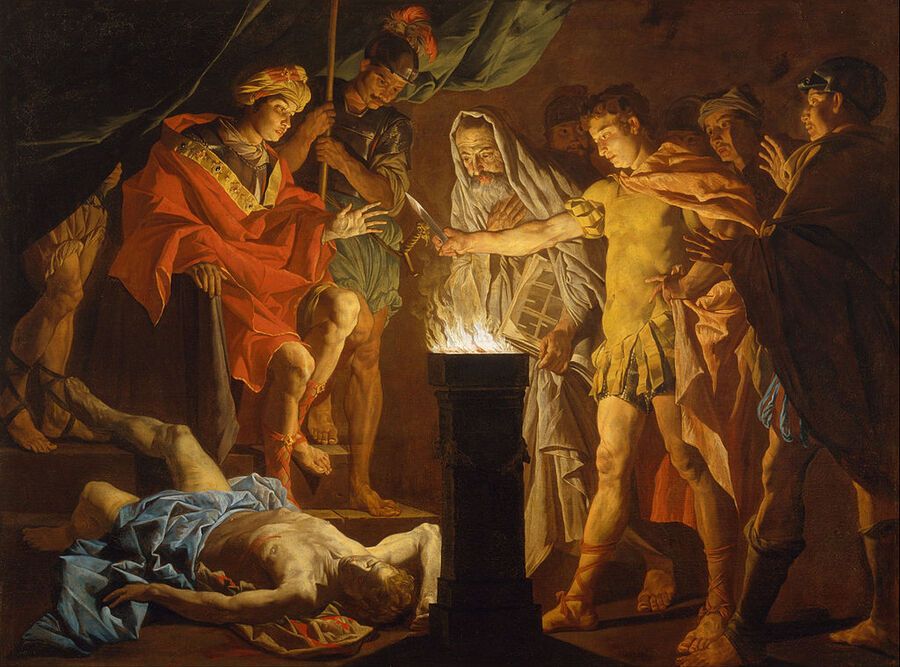 У Хосе де Риберы в «Мученичестве святого Варфоломея» (1644) натурализм достигает своего апогея. Это не просто сцена казни, а физически ощутимое свидетельство стойкости духа. Рибера безжалостно показывает тело в муках: напряжённые мышцы, вывернутые суставы, но главное — взгляд святого, устремлённый вверх, полный не отчаяния, а достоинства. Резкий свет выхватывает детали — лезвие, кровь, кожу, — погружая нас в самый драматичный момент. Тёмный фон концентрирует внимание на противостоянии: хрупкое тело против несокрушимой веры.