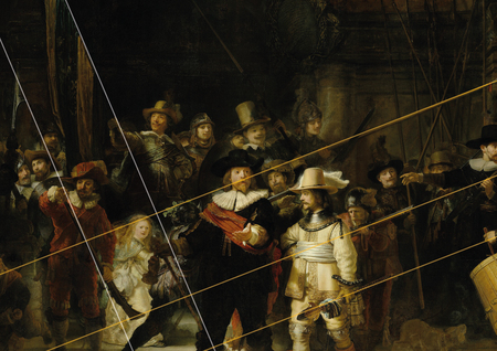 1. Направление шага Капитан явно шагает вперёд — нога поднята, плащ движется. Лейтенант движется в том же направлении, чуть позади — идеальная синхронизация лидера и заместителя. 2. Вращение пространства Через поднятые вверх пики, драпировку знамени и заряжаемую одним из стрелков аркебузу, ван Рейн как бы заворачивает пространства и тем самым вновь акцентирует внимание зрителя на двух командирах, попутно проводя его через всю картину.