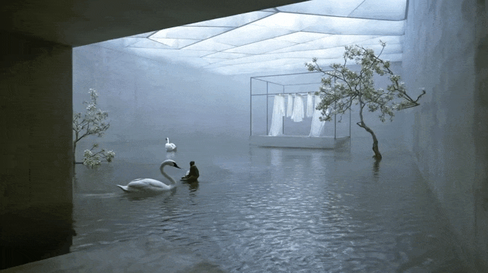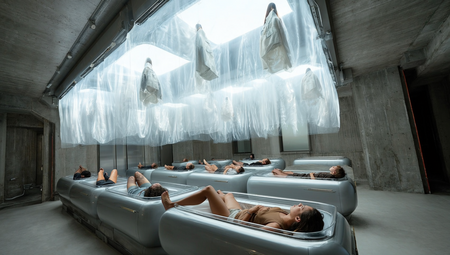https://higgsfield.ai/image/soul/job/a383adb4-6bed-45b9-acbf-fd7464701d55 пример промта: A spontaneous, intimate iPhone snapshot taken from the entrance of a vast, futuristic concrete hall inspired by the architectural minimalism of Tadao Ando and Philip Johnson. The scene captures immense depth with a straight-ahead view of a shallow reflective indoor lake spreading softly across the textured concrete floor, shimmering under diffused, natural white light that gives the space a calm, cold, and dreamlike atmosphere. Delicate organic branches grow out of the raw concrete walls, featuring two resting white birds and a nearby blooming white oleander with finely detailed petals. Suspended under the high ceiling is a rectangular metallic frame holding minimalist, sculptural flowing white garments inspired by Rick Owens, their fabric texture subtly highlighted by the ethereal ambient lighting. The composition is casually framed with a slight tilt, capturing a genuine, meditative stillness with soft reflections and natural imperfections on surfaces, emphasizing authentic skin, fabric, and material textures. Lighting and shadows fall naturally as would be seen in an authentic iPhone photo, balancing hyperrealistic architectural depth with poetic, cyber-organic metaphysical elements, embodying an editorial yet effortlessly intimate style.