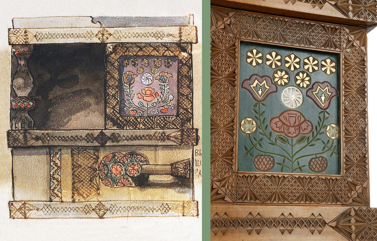 Баня-теремок в Абрамцеве, фрагменты. И. П. Ропет (1877–1878)