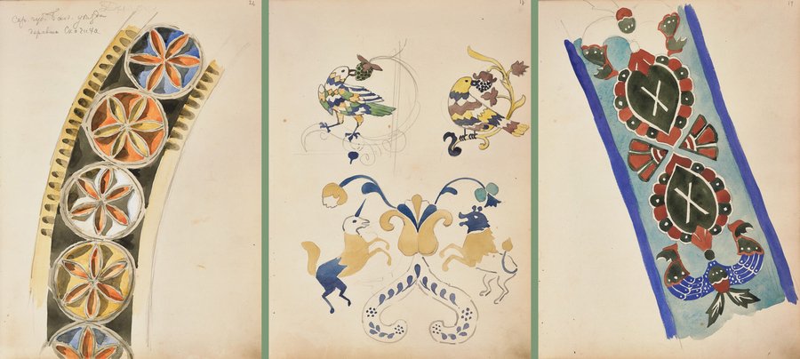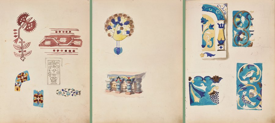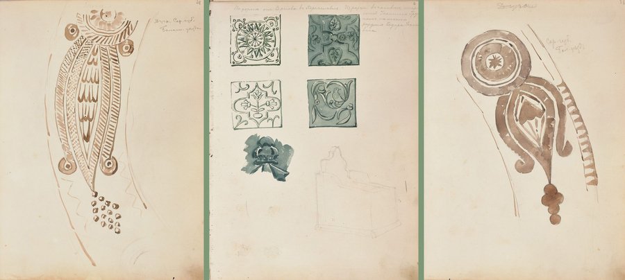 Эскиз столовой для М. Ф. Якунчиковой в Наре. Е. Д. Поленова, А. Я. Головин (1899); Стена с дверью. Эскиз интерьера столовой для загородного дома М. Ф. Якунчиковой. Е. Д. Поленова (1897–1898)