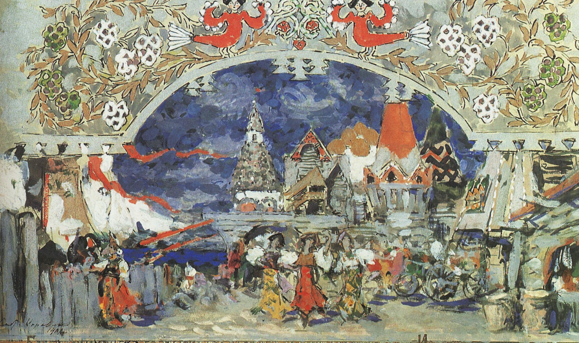 Заречная слободка Берендеевка. Эскиз декорации к опере «Снегурочка» Н. А. Римского-Корсакова. В. М. Васнецов (1885)