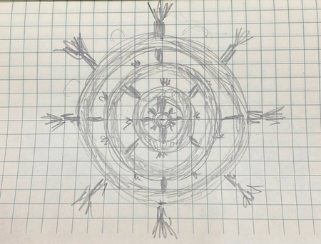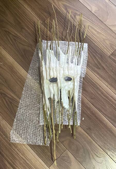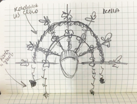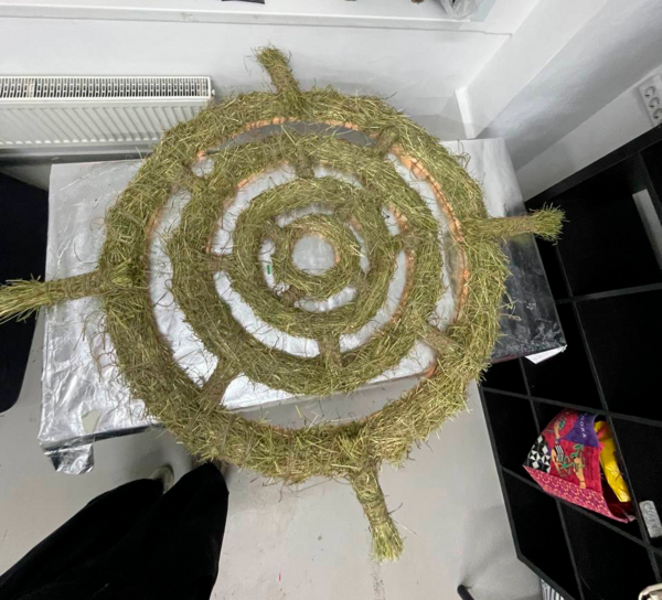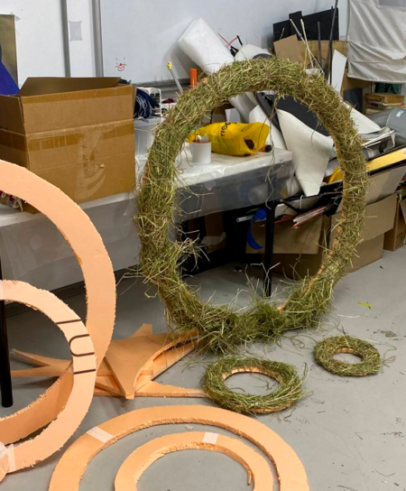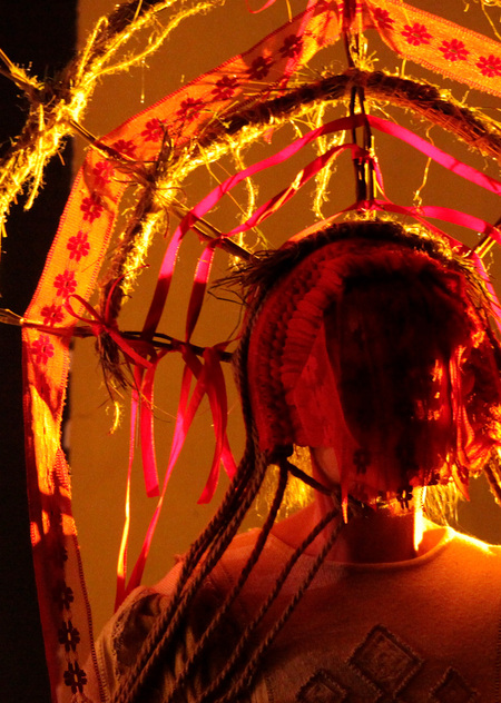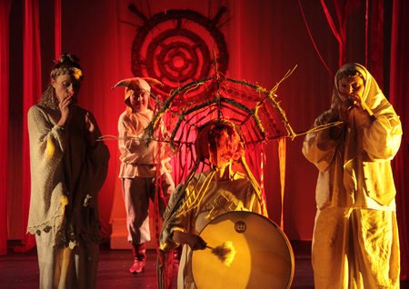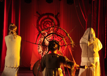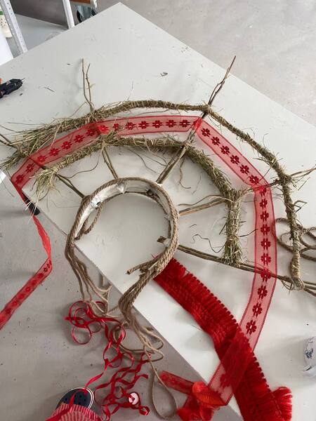 Для данного проекта я разработала и создала главный элемент сценографии (круг-солнце), кокошник Весны, серию метровых кос из бечевки, маску Деда Мороза и учавствовала в разработке остальной сценографии, чучела и костюмов.