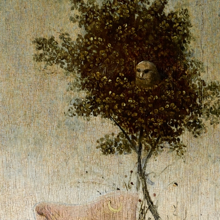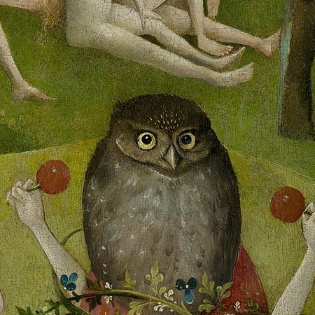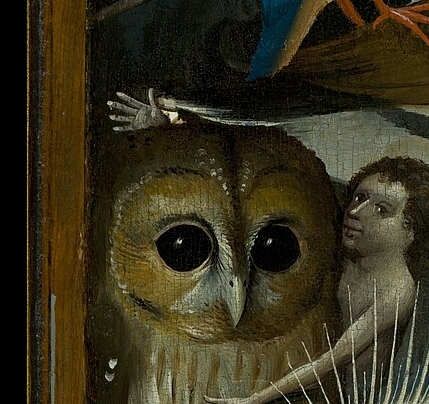 В самом «фонтане жизни» спряталась сова. Сова — узнаваемый образ в творчестве Иеронима Босха. Она встречается во многих его полотнах, таких, как «Корабль дураков» или «Воз сена», где внимательно следит или за зрителем, или за согрешившими героями. В «Саду земных наслаждений» она является ключевым образом, которого можно встретить около 5-6 раз. Сова является ночным хищником, который долго выслеживает жертву, чтобы схватить и съесть. В творчестве Босха она может символизировать дьявола, скрытого во тьме и терпеливо подстерегающего людские души.