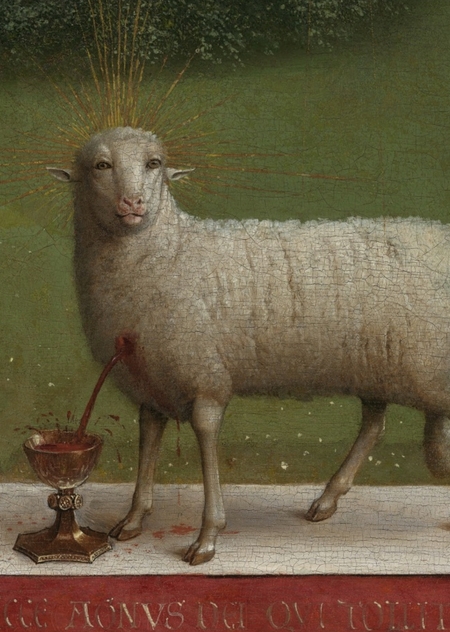 Ягненок в центре панели смиренно стоит на пьедестале, голова его сияет, а из раненного тела струится кровь, наполняющая кубок. Животное олицетворяет жертву Иисуса Христа перед человечеством. Образ кроткого агнца существует еще с Ветхого Завета. Он был пасхальным животным, которого принесли в жертву за грехи людей. В Новом же Завете Иоанн Креститель уподобил этот образ Христу. Кубок, наполняемый кровью ягненка, ни что иное, как Святой Грааль, а надпись на пьедестале гласит: «Се Агнец Божий, который принимает грехи мира».