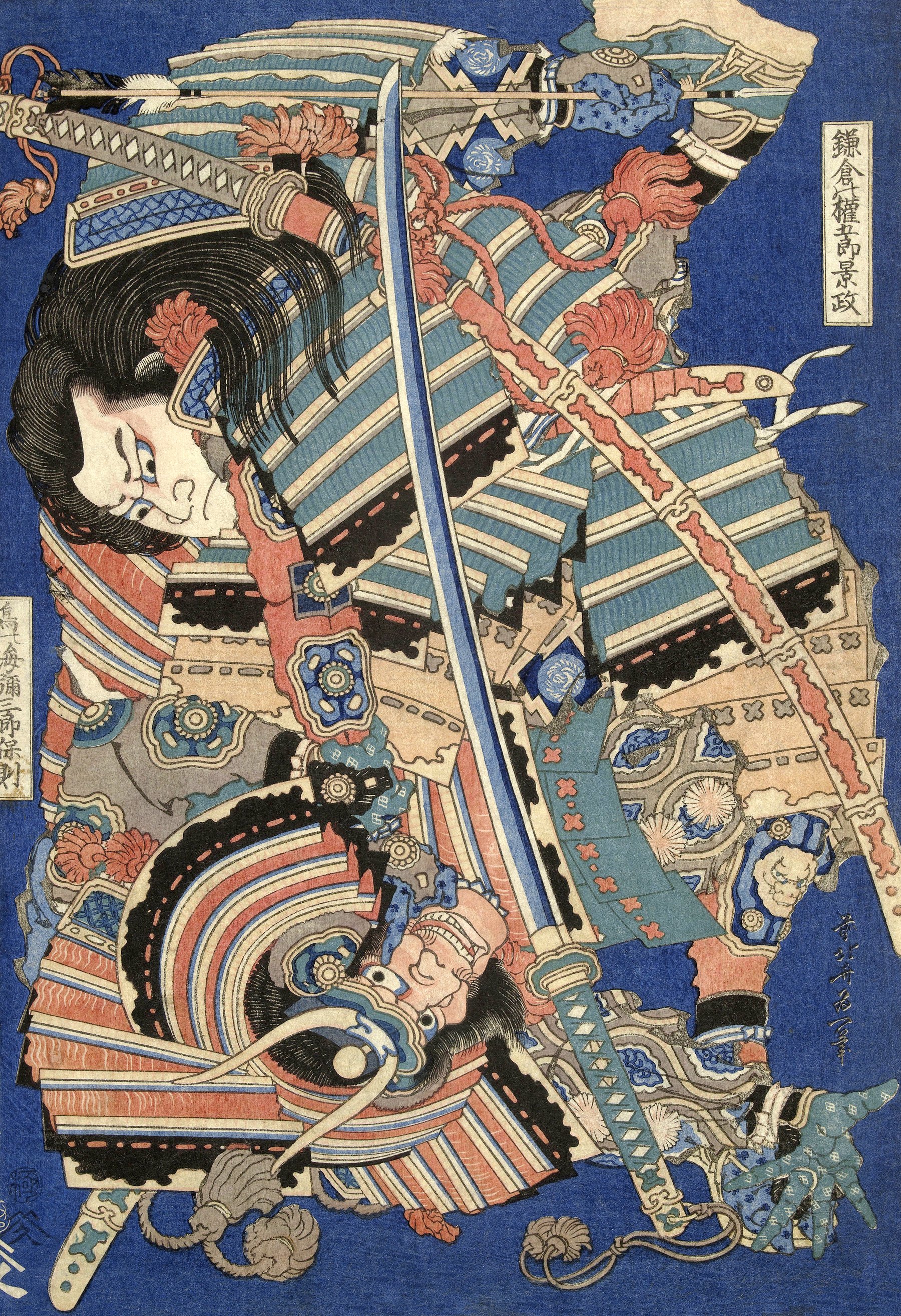 Композиция гравюры сосредоточена на двух героях, запечатленных в момент бескомпромиссной схватки. Великий самурай Камакура Гонгоро Кагэмаса (род. в 1069 г.) из клана Тайра, сражавшийся на стороне клана Минамото в эпохе Хэйан, бросает наземь своего противника Тори-но Уми Ясабуро Ясунори в шлеме. Все действо происходит на глубоком синем фоне. Их тела изогнуты в динамических позах, линии движения подчеркнуты контрастом темных и светлых пятен. Лица полны решимости и борьбы, отражая внутренний конфликт и невероятно силу духа. Хокусай мастерски использует линии и штрихи, чтобы показать одежду, мускулатуру и оружие, создавая ощущение движения и энергии.