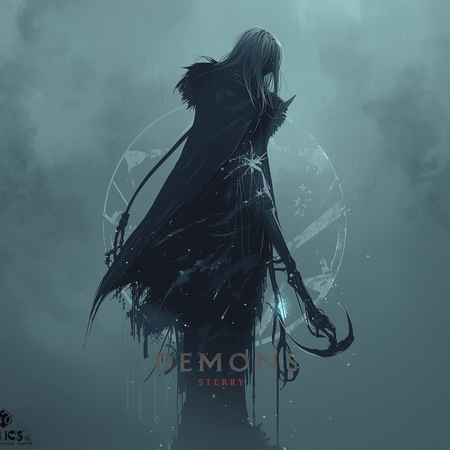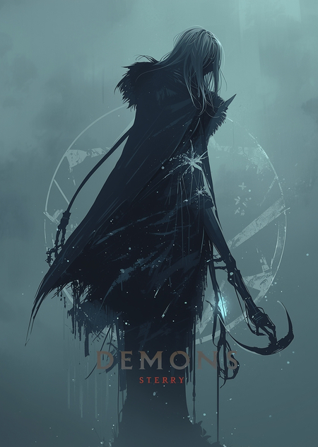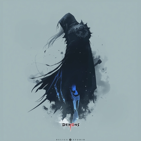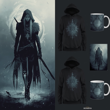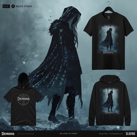 Merchandise design with a dark fantasy horror aesthetic, inspired by Slavic Rus motifs. Stylized silhouette of a thin, androgynous sorcerer monk with long silver-gray hair, hooded cloak with fur trim, and cybernetic leg. Mystical glowing runes subtly integrated into abstract shapes and layered silhouettes. Eerie, moody atmosphere with muted cold tones and subtle blue accents, fog, snow, and faint glowing particles. Include a small, clean logo and typography placeholder for Relics Studio and game Demons. High-impact, stylish, visually haunting, ready for print.