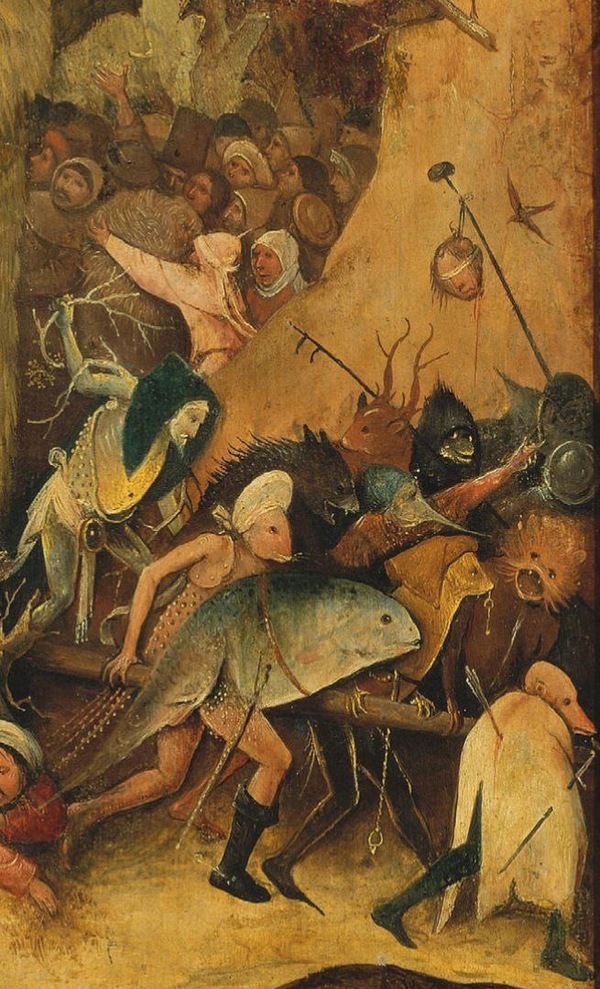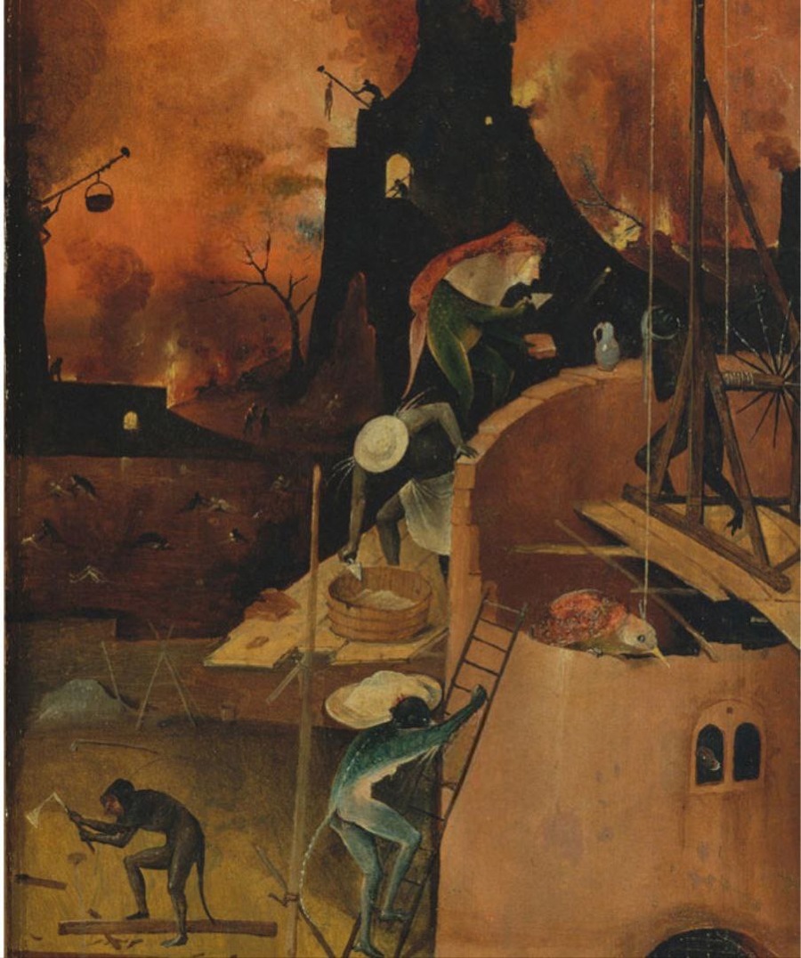 Третья честь триптиха изображает ад, как последствие греховной жизни. Это единственная работа, где Босх изображает преисподюю в незавершенном виде. Ад еще недостроен, но его уже заселяют грешниками. Черти несут голову с завязаными глазами, как символ того, насколько ослепляют мирские блага, что в погоне за ними, люди готовы лишиться головы. Конечно, Босх изображает ад как полный хаос, смешение людей, животных, демонов. Эта картина вселяет страх зрителю