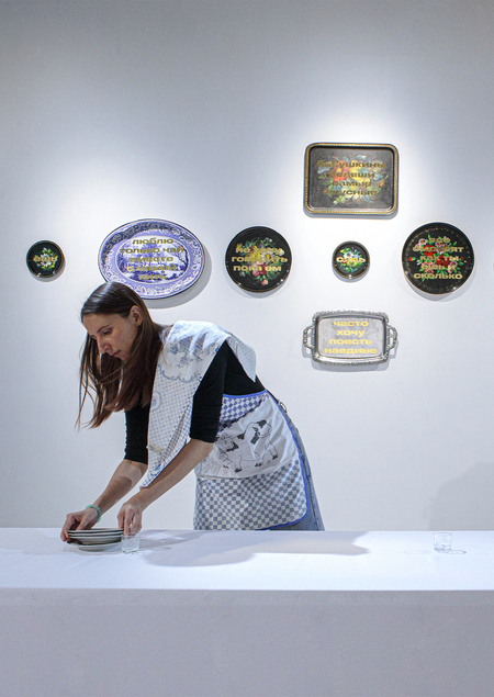 Инсталляция представляет собой композицию декоративных кухонных подносов, которые, помимо атмосферы кухни или столовой, которые они украшали, рассказывают истории людей, в чьих домах они хранились.