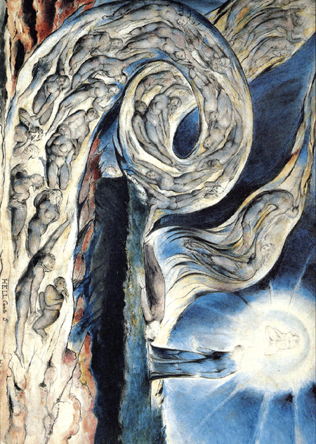 Блейк таким образом использует классическую романтическую схему «бури», где движение становится главным выразительным элементом. Спираль выполняет одновременно две функции: сюжетную (буквально выражает наказание, описанное Данте) и эмоциональную (материализует внутреннее состояние героев). Графическая структура напоминает некую систему знаков, что позволяет применить семиотический подход: линия становится визуальным знаком страсти.